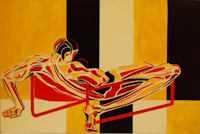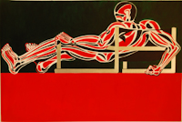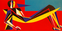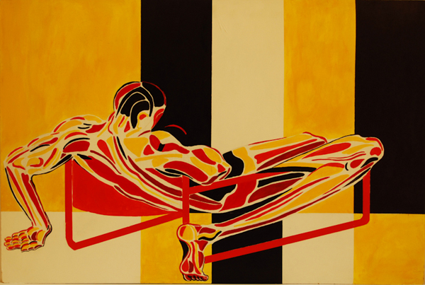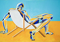 The Chair Man pictures evolved from a successful series painted and exhibited in London in 1972. British Arts Review said “…an impact something like Francis Bacon’s figures…” The London series was painted in muted browns, beiges and purples. American-style chair men are in solid, raw, often primary colors. All paintings are acrylic on board.
